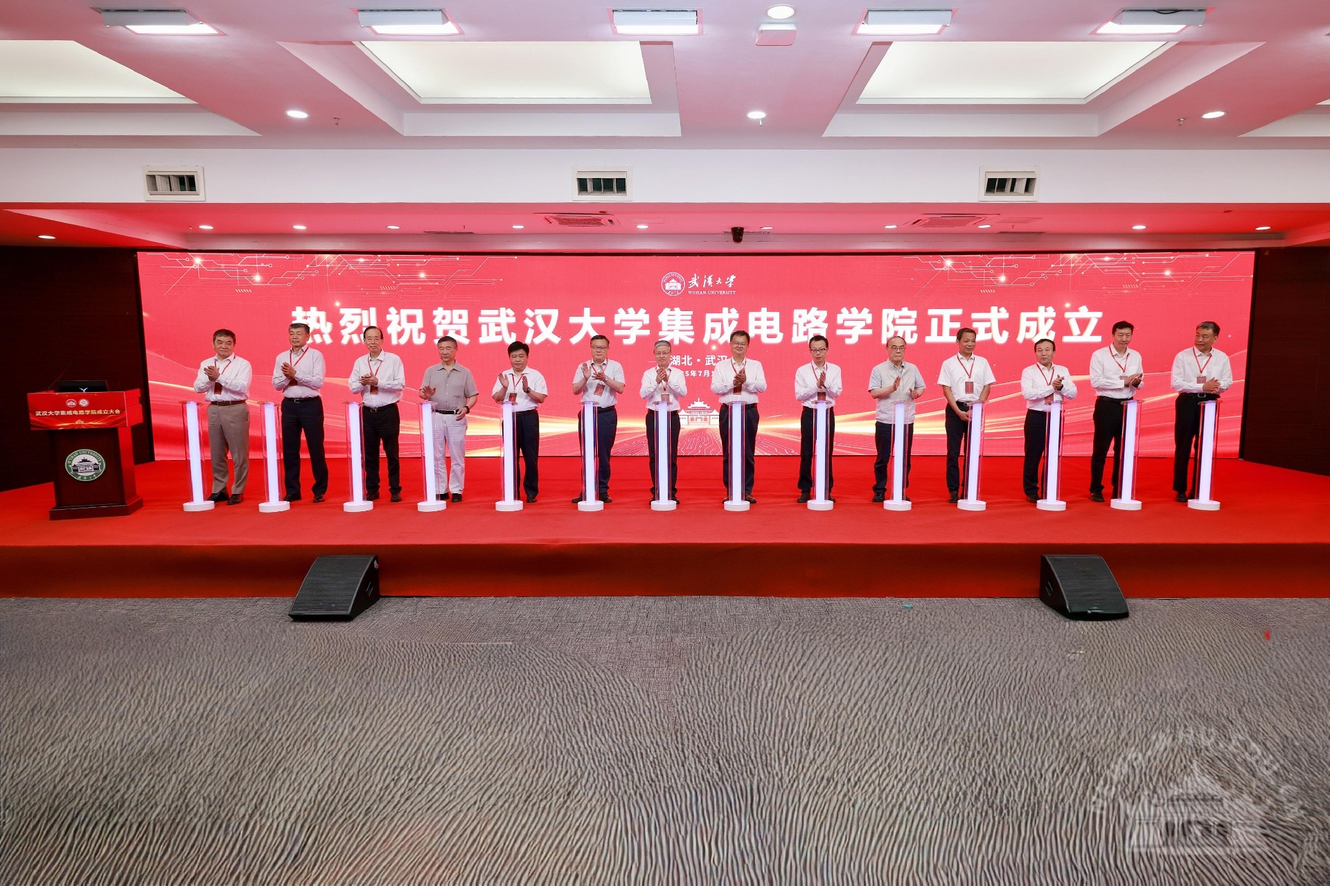 黄泰岩、张平文、张荣、沈悦、郭波、刘经南、姜德生、丁荣军、郝跃、俞大鹏、任占并、宋保亮、刘胜、陈南翔共同为集成电路学院揭牌。